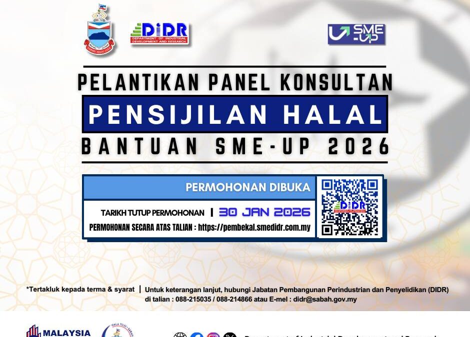 Salam Sejahtera, Salam Sabah Maju Jaya dan Salam Malaysia MadaniSukacita dimaklumkan bahawa permohonan sebagai Panel Konsultan DIDR bagi Program Bantuan SME-UP 2026 dalam Kategori Pensijilan Halal kini dibuka.